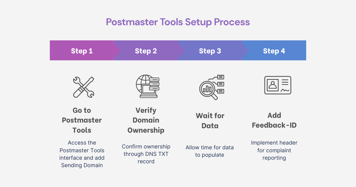 Postmaster Tools is a free set of dashboards for domain owners that aggregates Gmail-specific signals tied to deliverability and reputation. It includes (at minimum) dashboards for spam rate, domain reputation, IP reputation, feedback loop, authentication, encryption, and delivery errors.
